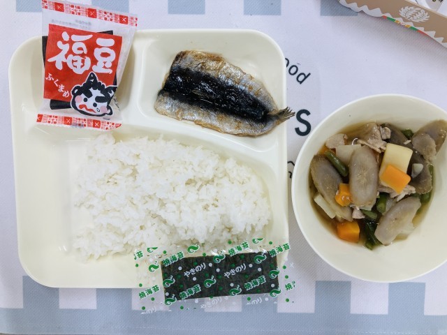 今日の献立は「いわしのしょうがじょうゆかけ、含め煮、いり大豆、ごはん、牛乳、中学校:焼きのり」でした。