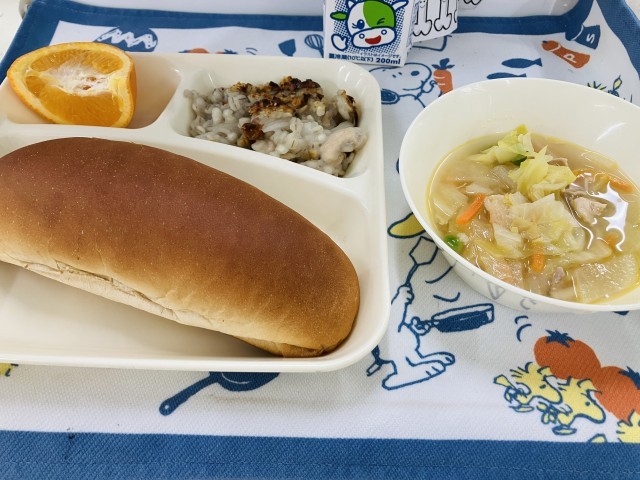 今日の献立は「押麦のグラタン、スープ、いよかん、黒糖パン、牛乳」でした。