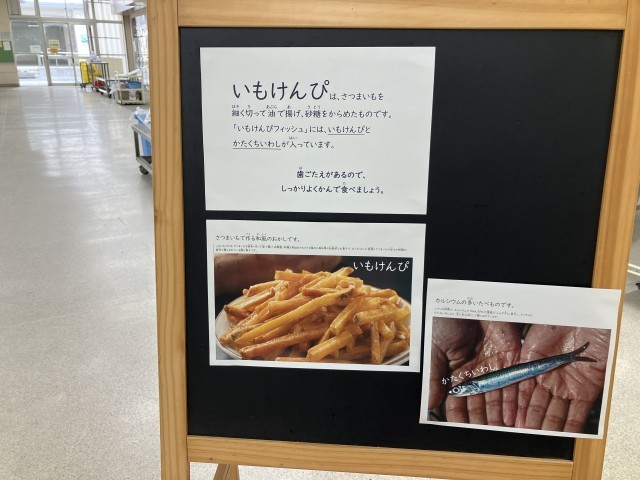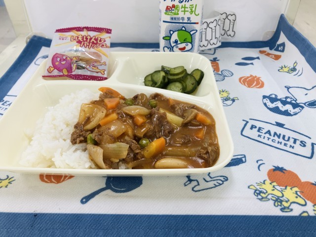 今日の献立は「ハヤシライス、きゅうりのバジル風味サラダ、いもけんぴフィッシュ、牛乳」でした。