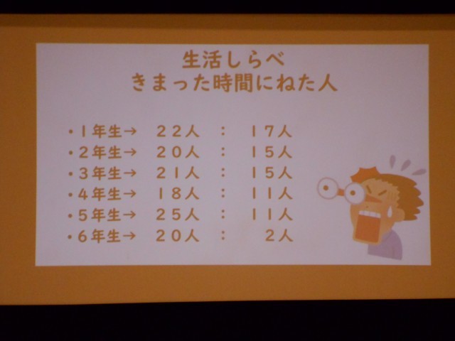 この発表を通して、一人でも多く「早寝早起き」をする児童が増えてほしいです。