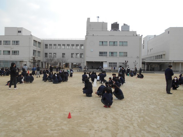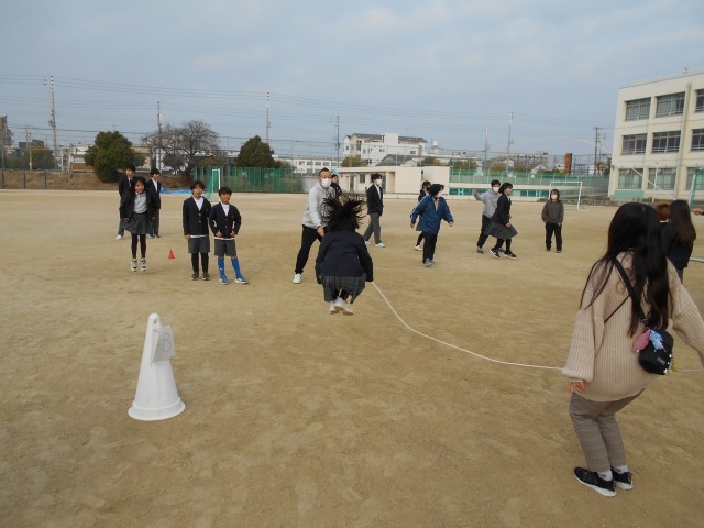 中学生が小学生に話しかけたり、班で跳び方を教え合ったりと、どの班も協力して活動していました。また、生徒会の生徒が遊ビジョンを進めてくれました。