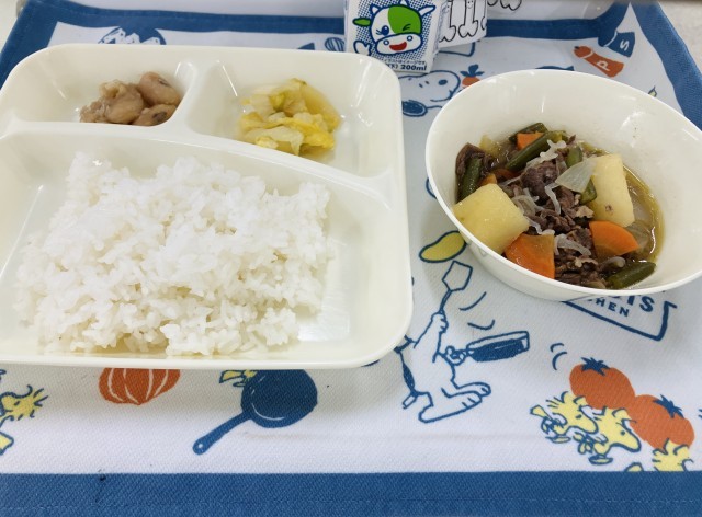 今日の献立は「肉じゃが、はくさいのゆず風味、白花豆の煮もの、ごはん、牛乳」でした。