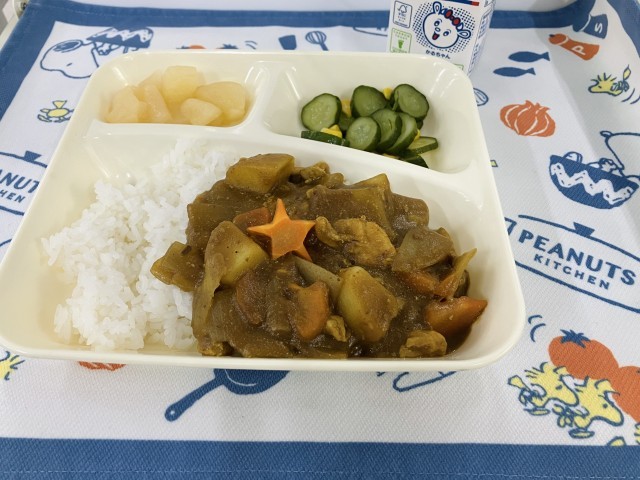 今日の献立は「チキンレバーカレーライス、きゅうりとコーンのサラダ、洋なし(カット缶)、牛乳」でした。