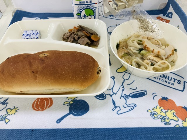 今日の献立は「豚肉とごぼうの煮もの、なにわうどん(とろろこんぶ)、固形チーズ、コッペパン、レーズンパン、牛乳」でした。なにわうどんは、きつねうどんをイメージしています。三角形に切って、あまからく煮たうすあげ、かまぼこ、はくさい、青ねぎが入ったうどんにとろろこんぶを入れて食べます。