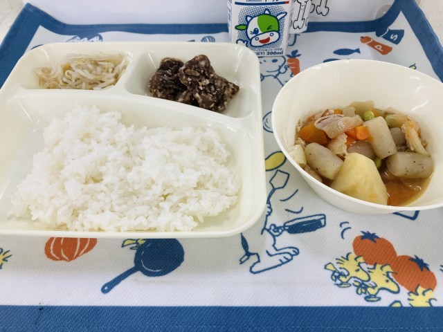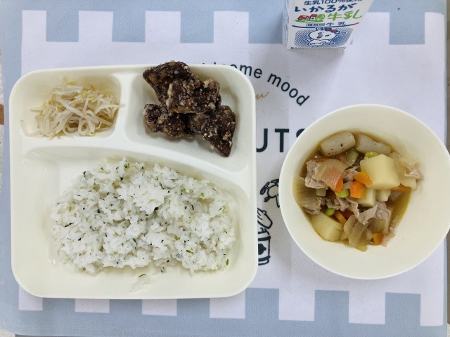 今日の献立は「くじらのたつたあげ、豚肉とじゃがいもの煮もの、もやしの甘酢あえ、小学校:ごはん、中学校:菜飯、牛乳」でした。日本では、昔からくじらを使ったさまざまな料理が食べられてきました。肉だけでなく、皮や内臓、尾びれまで工夫して無駄なく利用するので、くじらは「捨てるところがない」と言われます。くじらの肉には、体をつくるもとになるたんぱくし質のほか、不足しやすい鉄が含まれています。