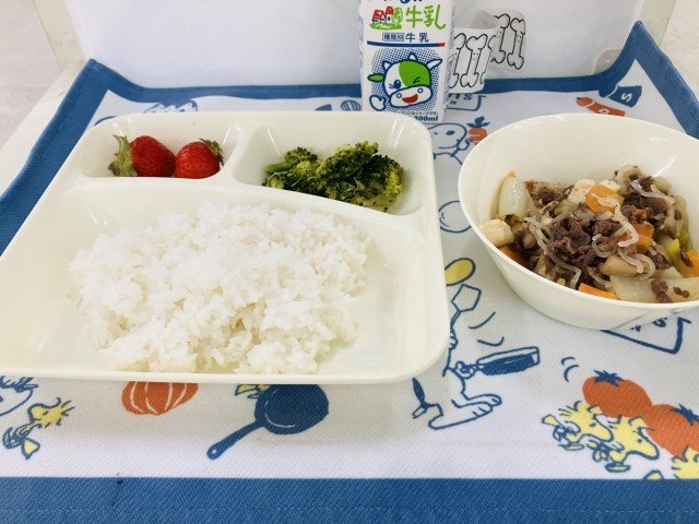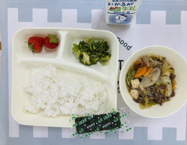今日の献立は「すき焼き煮、ブロッコリーのしょうがづけ、いちご、中学校:焼きのり、ごはん、牛乳」でした。いちごは、江戸時代に観賞用としてオランダから伝えられました。いちごは、果物の中でも特にビタミンCを多く含んでいます。ビタミンCには、傷の回復を早めたり、病気に対する抵抗力を強めたりする働きがあります。