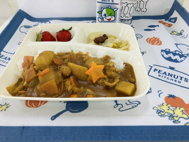 今日の献立は「チキンカレーライス、金時豆と野菜のサラダ、いちご、牛乳」でした。