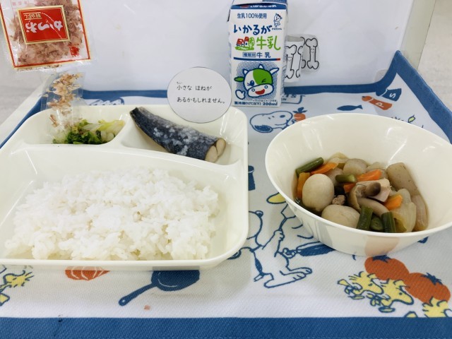 今日の献立は「さごしの塩こうじだれかけ、さといもと野菜の含め煮、なのはなのおひたし(かつおぶし)、ごはん、牛乳」でした。
