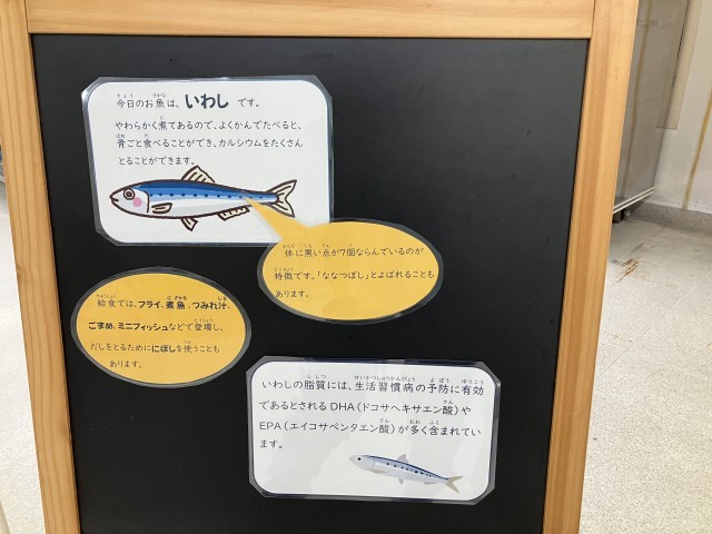 いわしには、筋肉や血液をつくるもとになるたんぱく質のほかに、脂質も含まれています。いわしの脂質には、脳の働きをよくするDHA(ドコサヘキサエン酸)や血液の流れをよくするEAP(エイコサペンタエン酸)が豊富に含まれています。今日は、いわしをフライにしています。骨ごと食べることができるので、骨や歯をじょうぶにするカルシウムもたくさんとることができます。