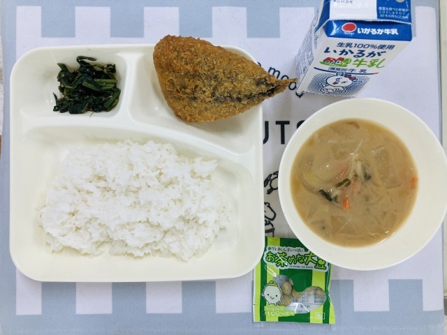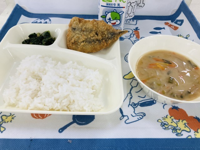 今日の献立は「いわしフライ、みそ汁、ほうれんそうのごまあえ、中学校:まっ茶大豆、ごはん、牛乳」でした。