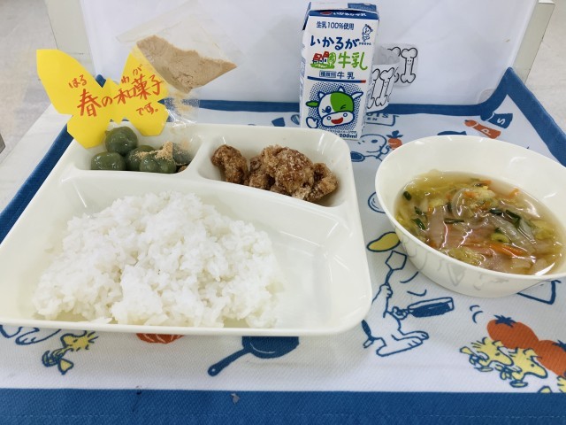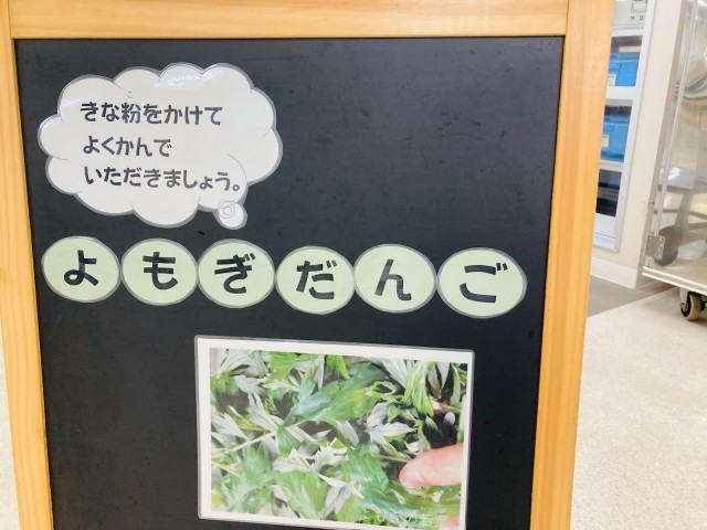 給食のよもぎだんごは、うるち米、もち米、よもぎから作られています。よもぎは、山や野原で自然に生えている春の野草です。やわらかな新芽をすりつぶして、だんごに入れます。今日は、あまいみつをからめたよもぎだんごに、きな粉をかけて春の和菓子をいただきました。