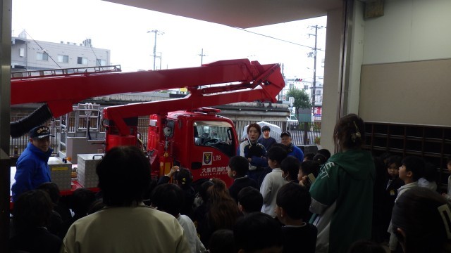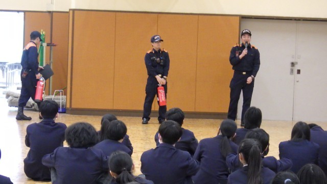 全校で火災を想定した避難訓練が行われました。また、低学年は消防車見学、中学生は消火器の使い方についてレクチャーを受け、防災意識を高めました。火災は起きないことが一番ですが、万が一に備えて避難の仕方や対処法を知っておくことが大切です。