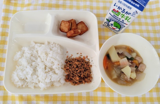 本日の給食は「鶏肉とじゃがいもの煮もの、あつあげのしょうゆだれかけ、紅ざけそぼろ、ごはん、牛乳」でした。