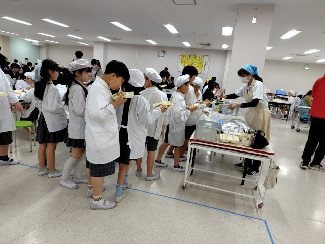 「紅ざけそぼろ」は鮭フレークに、料理酒、みりん、うす口しょうゆで味付けし、いりごま、青のりで風味を出しています。ごはんがすすむ学級が多かったように思います。「おかわり!」で長~い行列ができていました。簡単に手早くできるので、ぜひご家庭でも作ってあげて下さい。