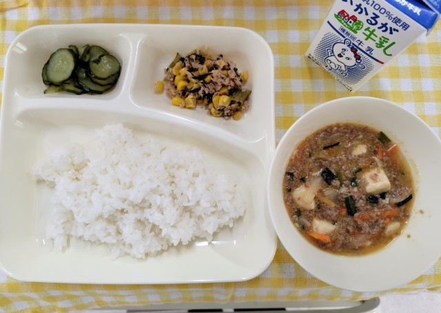今日の給食は「マーボーどうふ、きゅうりの中華あえ、ツナとチンゲンサイのいためもの、ごはん、牛乳」でした。