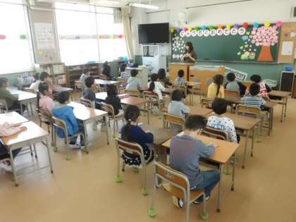 1年生は初めての授業、どんな挨拶をするのか・登校したら何をするのか・帰るときにはどんな準備をするのか・自分は何グループなのか、一生懸命に聞いて勉強しました。又、ゲーム・手遊び・紙芝居なども楽しみました。