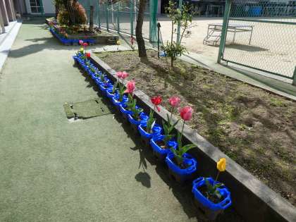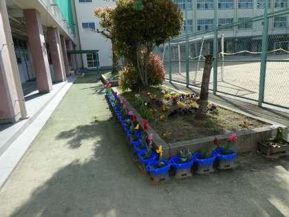 昨年植えたチューリップの花が職員室前を鮮やかに