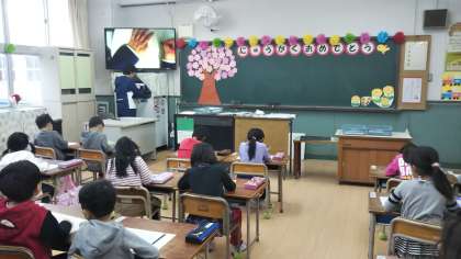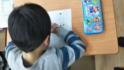書画カメラを通して大型テレビに映し出された先生のお手本を見て、一生懸命書きました。