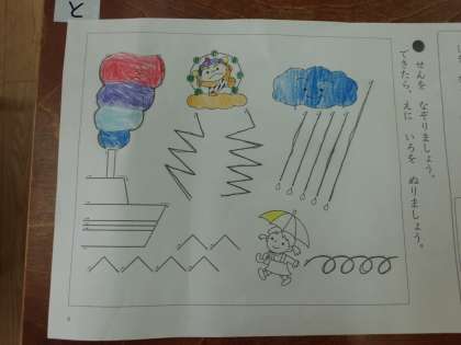 鉛筆で線をたて・よこ・ななめにひいたり、まるまると動かしたりして字を書く前段階のお勉強です。