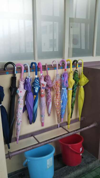 登校後、各学級の傘置きには整理して置かれた傘が並んでいました。