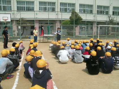 今日は、東住吉警察の方に来ていただき、自転車を使っての交通安全指導を行いました。