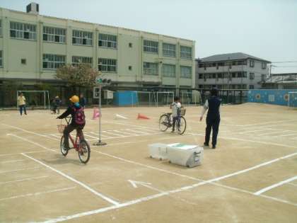 警察の方からのはじめの話で、安全確認がとても大切だということを聞きました。その後、運動場に描かれた模擬道路を実際に自転車で通行しました。子ども達は、交差点に差しかかった時や歩道から車道に出なくてはいけない時、しっかりと安全確認をしていました。その様子を見て、警察の方が、「とても上手に安全確認をして自転車に乗れていました。この安全な乗り方をぜひ日ごろから実践してほしいです。」と話されていました。