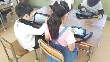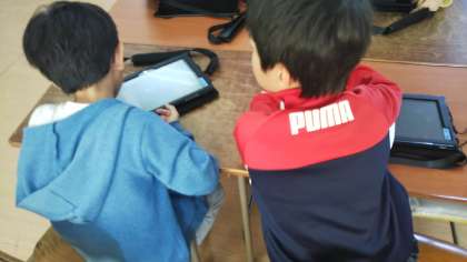 学校や地域で春のくらしを探します。今日は、タブレットでカメラの使い方を学習しました。