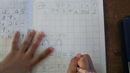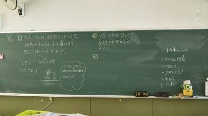 今日は「ひろこさんは45円もっています。18円のチョコレートを買います。のこりはいくらですか。」という問題をしました。