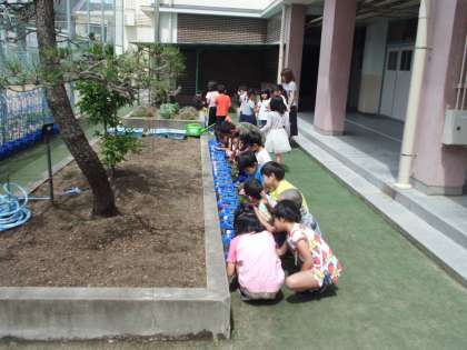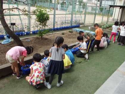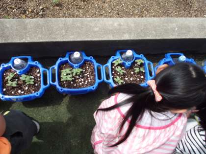 1年生が育てているアサガオにおいごえ(追肥)をしました。
