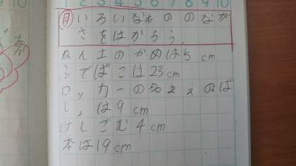 cm(センチメートル)という単位を学び、教室にあるいろいろな物の長さを測りました。「筆箱は〇cm!」「鉛筆削りは〇cm!」と楽しそうに測る様子が見られました。