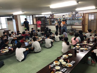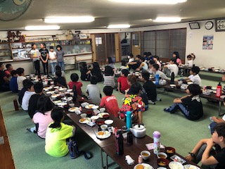 少し雨が降っているため予定を変更し、外で予定にしていた朝の集いを、食事前に食堂で行いました。