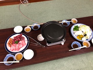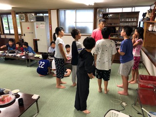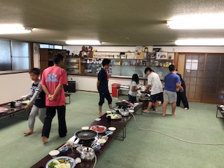 食事係が準備を手伝って、いただきますの打ち合わせ中です。