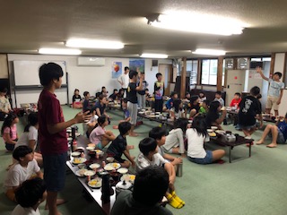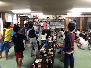 雨が降っていますが、子供たちはみんな元気です。今日も朝の集いは、朝食前に食堂で行いました。今から朝食です。