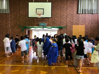 うどん打ちの後、昨日作った焼き板を、宿舎近くの体育館まで取りに行きました。