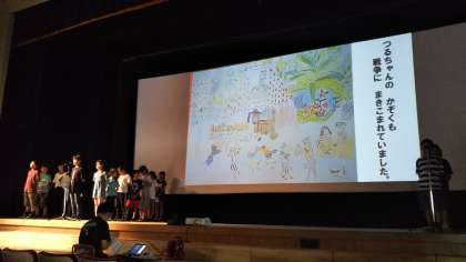 子連協役員会に参加している児童が、スライド劇「おきなわ島のこえ ヌチドゥ タカラ〜いのちこそ たから〜」の声出し練習をしました。