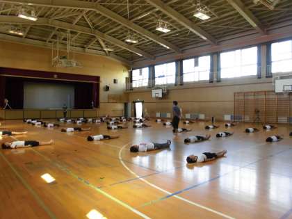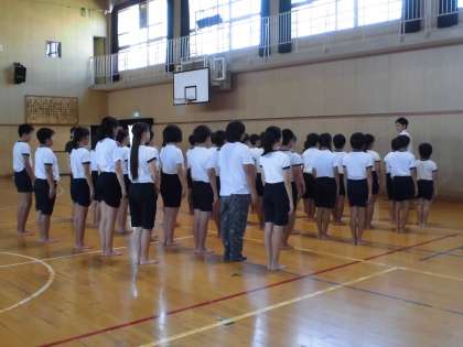 今日は、練習に向けての心構えを身に付けたり、一人技の練習をしたりしました。今後、友達と協力して行う技をしたり、音楽に合わせたりして、完成度を上げていきます。
