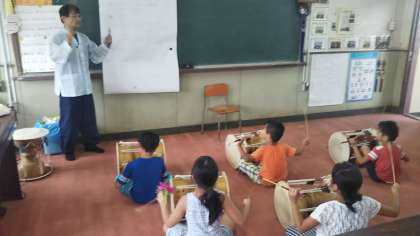クッコリというリズムに合わして演奏をしました。1年生も上手に叩くことができました。周りで見ていた先生方も自然と手が動いて、一緒にリズムをほどそろった音色でした。