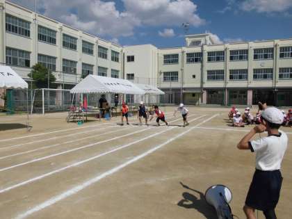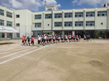 学年の練習では、前半はリレー、後半は団体演技の練習をしました。2つとも、入場から退場まで通しました。