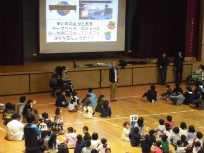 1.第2部の学年交流が終わり、作業所の方と5年生が講堂に集まりました。そして、簡単にお別れのセレモニーをして、記念にみんなで集合写真を撮りました。5年生はもちろん、作業所の方も全員、充実感あふれる笑顔をしていました。