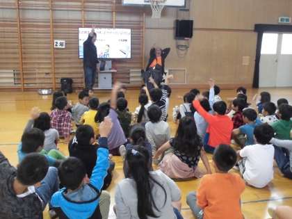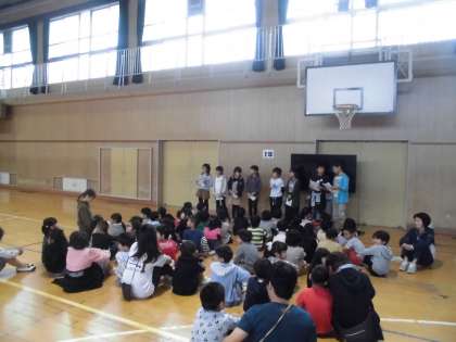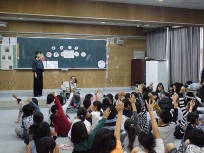 第1部の全体交流では、5年生のエスコートで作業所の方が講堂に入場してきました。各学年に入る作業所の方を紹介した後、赤おにさんから『赤おに作業所』という名前の由来を聞きました。「姿・形はみんな違う。見た目だけで怖がらずにいろいろなことを話してみよう。そして、新しい発見をしよう。誰もがありのままの姿で生活していくことができればいいなあという思いを込めて名付けられた。」と教えてくださいました。