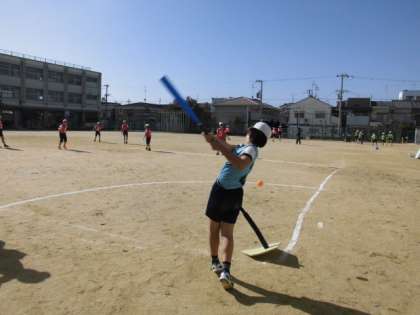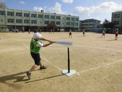 その後、設定された学習の場をグループで回って練習しました。学習の場は、上手に打つことができるようになるためのTバッティングの場、コントロールよく投げることができるようになるための的当ての場、素早くベースを走ることができるようになるための走る場、チームワークを高めることができるようにするためのキャッチボールの場に分かれています。子供たちは、楽しみながらもそれぞれの場のめあてをしっかりと意識して練習に励んでいました。