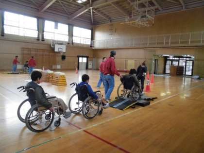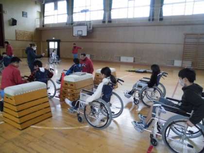 その後、車いすに乗って自走(車いすに乗って自分一人で車いすを操作する)体験をしました。子供たちから、「少しの段差や緩い上り坂でも登れない。」「まっすぐ進めない。」「下り坂になると怖い。」などの声が聞かれました。