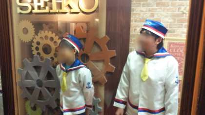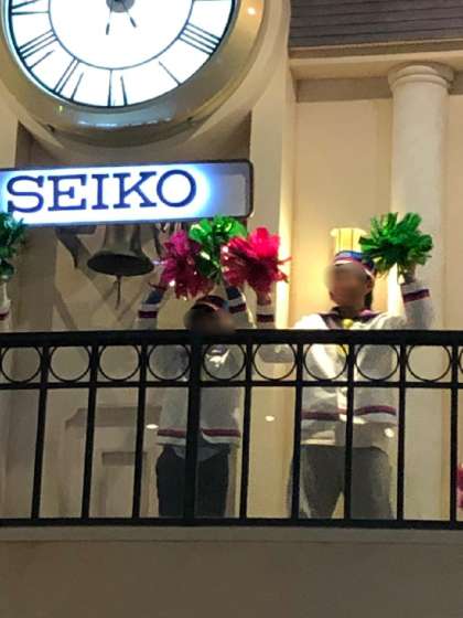 時間になったら時計台前のバルコニーにからくり時計の人形役として登場し、