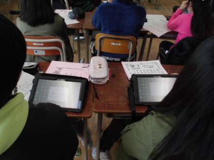 今日は、子供たち一人一人が推薦する字からクラス討論会を通してクラスで推薦する字を選びました。自分の考えを言ったり、友だちの考えを聞いたり、それに対して意見を言ったりと、白熱した討論会になりました。討論会の間、タブレットを通して、自分が推薦したい字に投票していき、その結果が刻々と大型テレビに映し出されていきました。