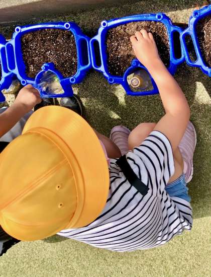 外に出て、植木鉢に土を入れます。