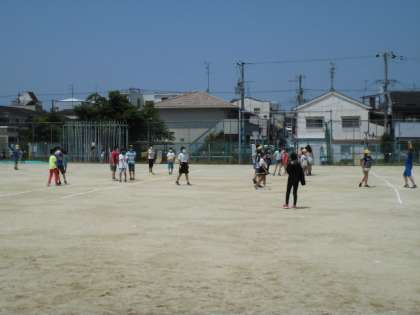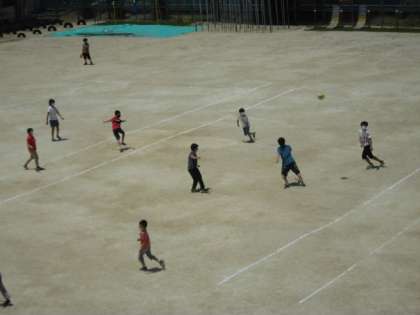 運動場の真ん中ではドッジボール、周りでは鬼ごっこやだるまさんが転んだなどをしています。その中に教師も入り、子ども達との関係づくりに励んでいます。