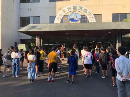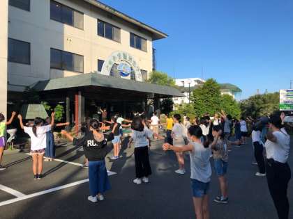 宿舎の前で朝の集いとラジオ体操をして、今から朝食です。
