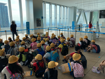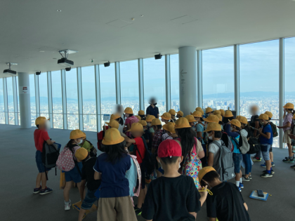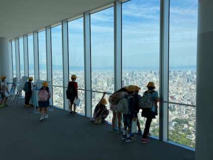 社会見学でアベノハルカス展望台に行きました。グループで協力して、地上300メートルから見える大阪のまちの様子について調べました。