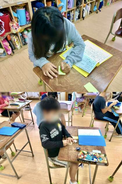 友だちと読み合い、付箋に感想を