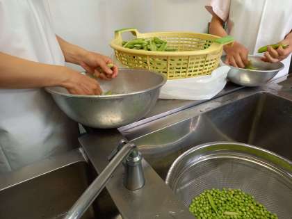 今日は「えんどうの卵とじ」がメニューにありました。このえんどうですが、実は給食調理員さんたちが、さやからむいてエンドウ豆にしています。一つ一つ丁寧にむいているので、いつもよりも時間と労力がかかります。給食調理員さんたちは、中学校の給食も一緒に作っているのを知っていますか?中学校と小学校の人数分の量を想像してみてください。給食調理員さんたちの仕事はとてもすごいことが分かりますね。